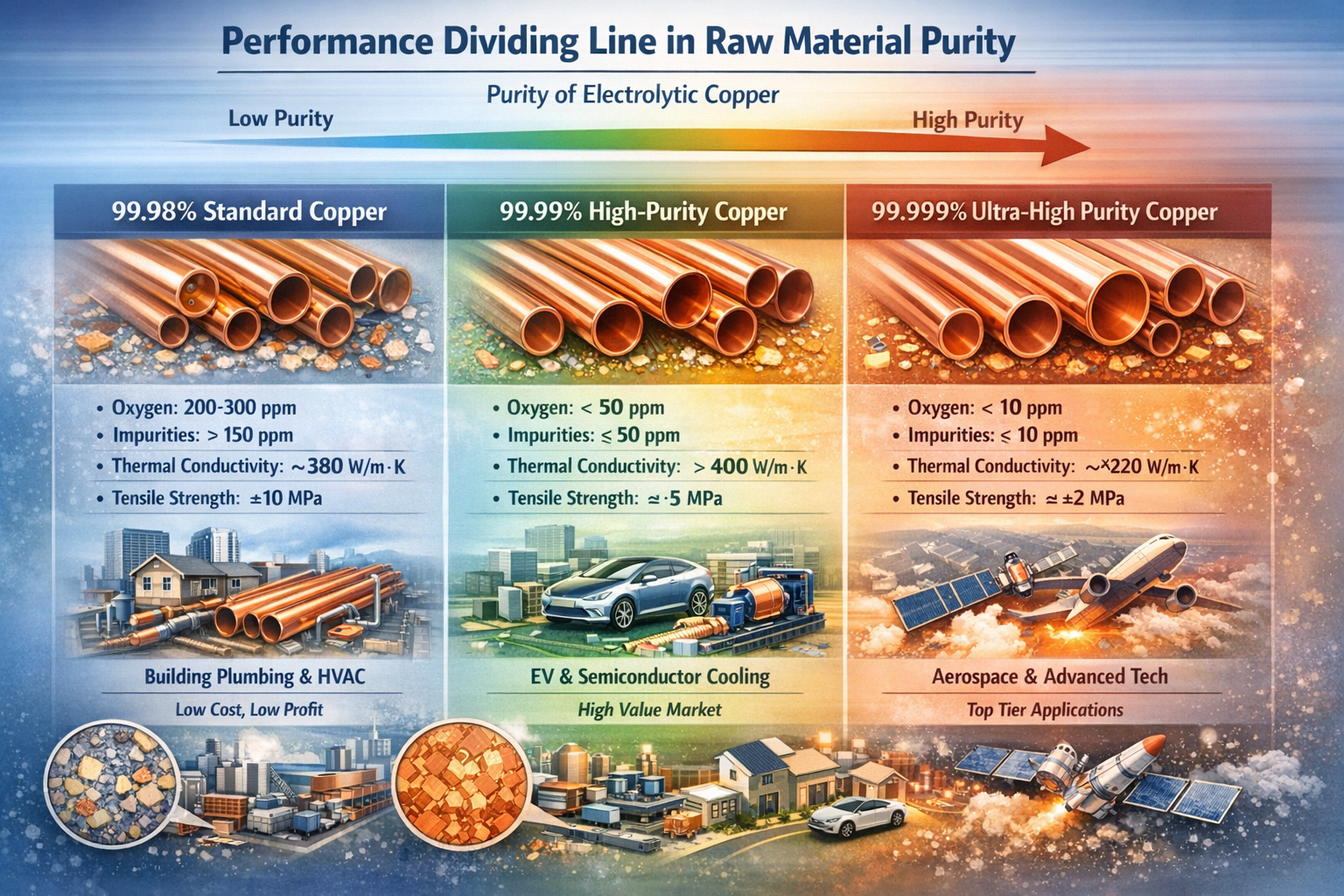 | Уровень чистоты сырья | Содержание основных примесей (ppm) | Характеристики медных труб после обработки | Применимые сценарии | Стоимость закупки сырья (юаней/тонна) | Прибыль от продукта на тонну (юаней) | Уровень дефектов продукта |