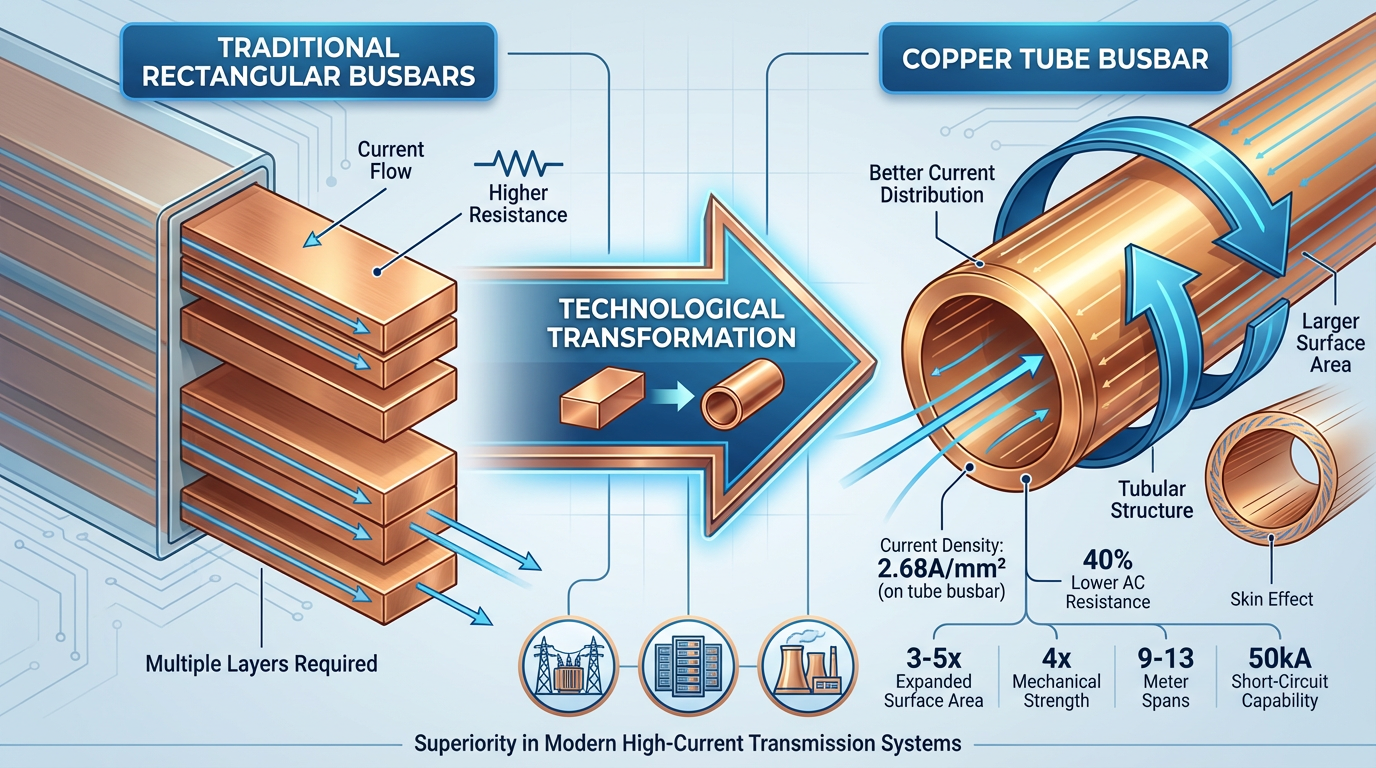 Модернизация глобальной энергетической инфраструктуры стимулирует беспрецедентный спрос на медная трубка шины. Хотя эта продукция составляет лишь 2–3% от общего спроса на медные трубы, темпы роста этой продукции превышают 200% ежегодно в таких приложениях, как подстанции сверхвысокого напряжения, центры обработки данных и новые электростанции. Основное преимущество заключается в их полая трубчатая конструкция , что увеличивает площадь поверхности проводника в 3-5 раз, обеспечивает равномерное распределение тока по стенке трубки, снижает коэффициент скин-эффекта ниже 0,8, снижает сопротивление переменному току на 40 % по сравнению с прямоугольными шинами эквивалентной площади сечения.
