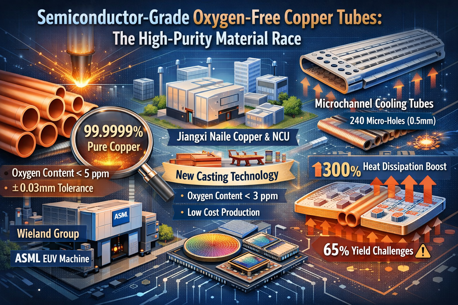 Прорывы в экономически эффективный альтернативы появляются. Компания Jiangxi Naile Copper в сотрудничестве с Наньчанским университетом разработала «метод горизонтальной непрерывной разливки со сверхнизким разделением кислорода», который контролирует содержание кислорода ниже 3 частей на миллион, что составляет одну восьмую стоимости импортных вакуумных методов. Это нововведение вошло в цепочку поставок 14-нм производственных линий SMIC. Более продвинутые применения включают охлаждающие трубки на уровне пластины с микроканальные конструкции (например, 240 микроотверстий диаметром 0,5 мм) для повышения эффективности рассеивания тепла на 300 %, хотя процент выхода остается проблематичным и составляет 65 %.