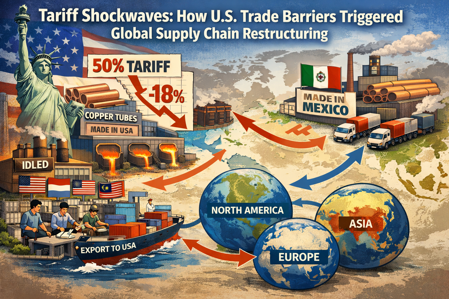 Подзаголовок: Когда США ввели 50-процентные тарифы на медные трубы, что вызвало реструктуризацию глобальной торговой цепочки, как производственные мощности в Юго-Восточной Азии и Мексике выросли на 46,3% за год? Эта миграция цепочки поставок, обусловленная политикой, меняет глобальную карту распределения стоимости медных труб.