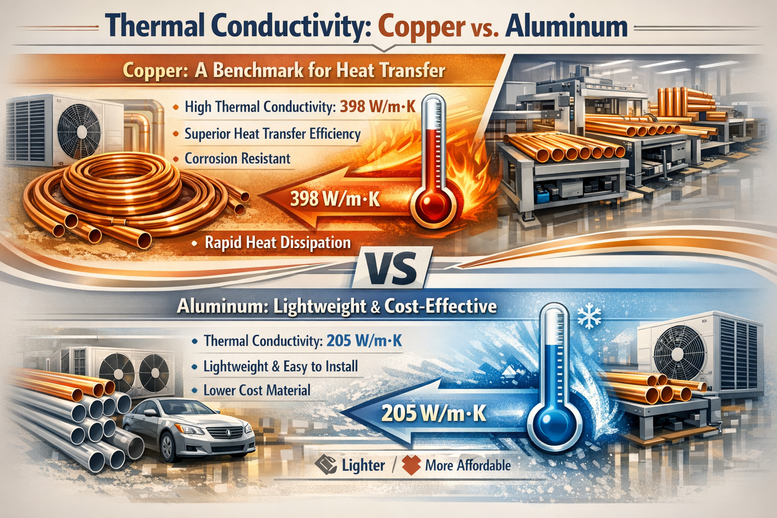 В этой таблице показаны явные различия между медь и алюминий трубки, с медь предлагая превосходный теплопередача но по более высокой цене, в то время как алюминий более легкий и экономически эффективный но имеет компромиссы в производительности и долговечности.