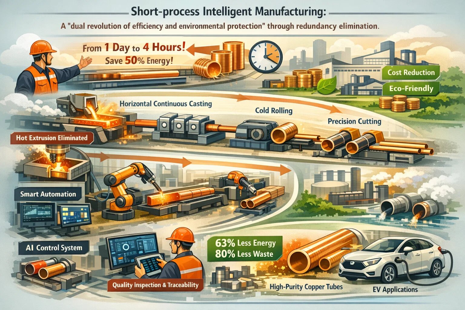 Основные достижения заключаются в «упрощении процессов» и «интеллектуальном расширении прав и возможностей». Традиционный этап «горячей экструзии» напрямую исключается, а технология ультразвукового литья используется для оптимизации кристаллической структуры трубной заготовки, уменьшения сегрегации металла и приводит к шероховатости внутренней поверхности ≤0,8 мкм, что позволяет перейти непосредственно к процессу холодной прокатки без последующей полировки. В производственной линии с тремя печами горячего производства компании Southwest Copper интегрированная конфигурация «Рафинирование в вращающейся анодной печи с непрерывным рафинированием с боковым дутьем, обогащенной кислородом, с несколькими фурмами и с верхним дутьем» обеспечивает непрерывное производство от медного концентрата до анодной меди с годовой мощностью переработки 1,6 миллиона тонн. Это сокращает три этапа передачи по сравнению с традиционными процессами и сокращает площадь, занимаемую оборудованием, на 40%.