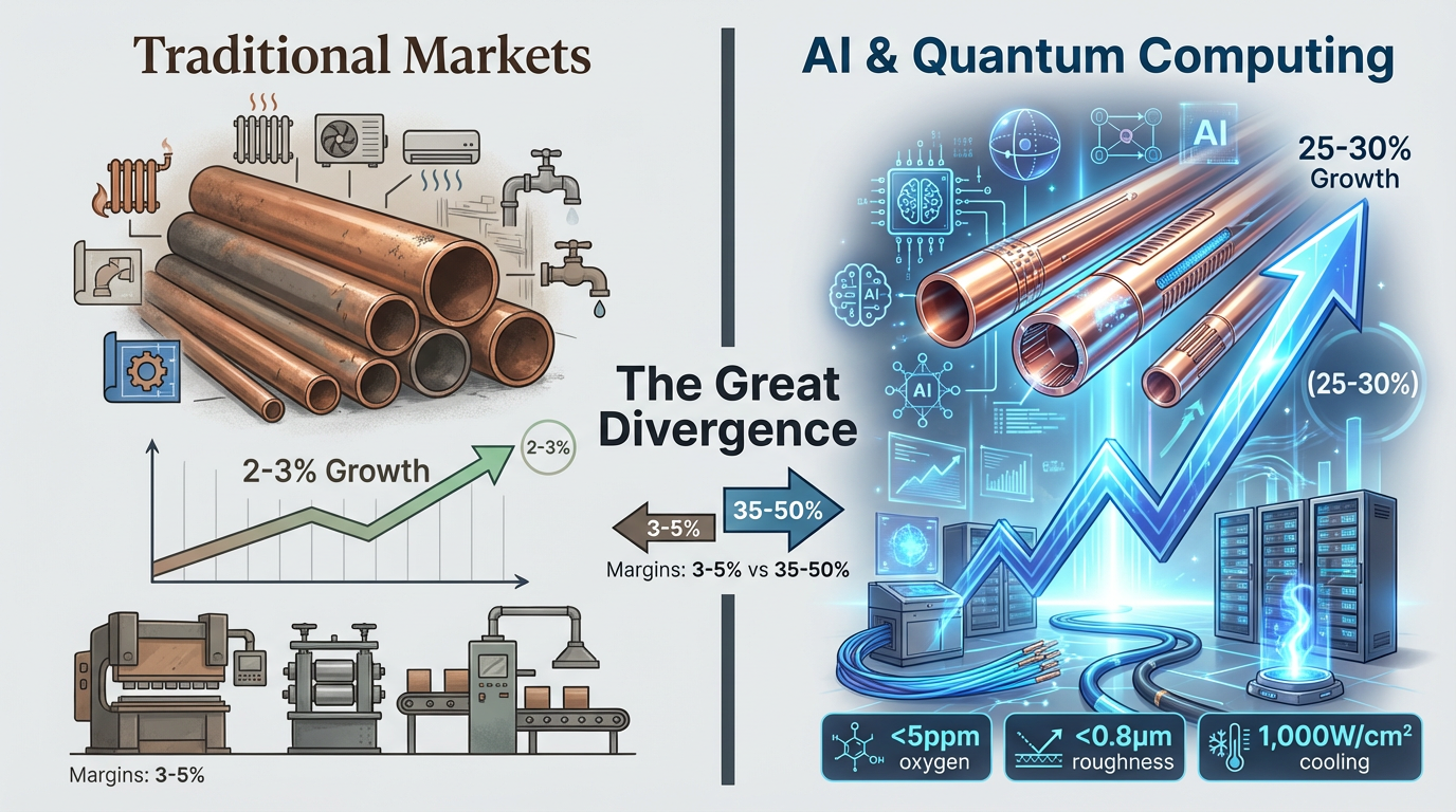 Глобальный медная трубка промышленность переживает беспрецедентную фрагментацию. Пока традиционная конструкция и Приложения HVAC расти на скромные 2-3% в год, спрос на прецизионные трубы в производстве полупроводников, инфраструктуре искусственного интеллекта и квантовых вычислениях темпы роста растут на 25–30% в год. Это расхождение создает двухуровневый рынок: оптовые производители борются с прибылью в 3-5%, в то время как специализированные производители получают валовую прибыль в размере 35-50% для труб, соответствующих экстремальным спецификациям.