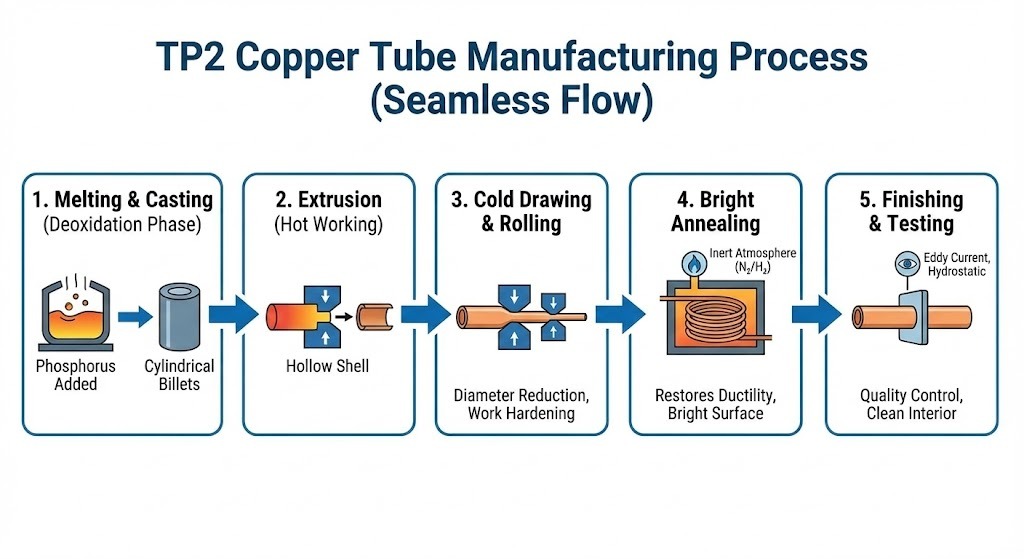 Производство медных труб ТП2 – это путь от высокотемпературной плавки к высокоточной холодной обработке. Большинство трубок TP2 премиум-класса производятся как бесшовные трубы , что исключает риск разрушения сварного шва.