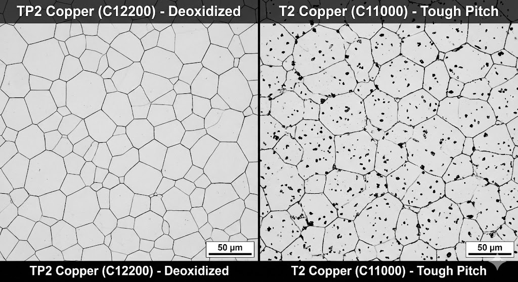Основное значение меди TP2 заключается в ее свариваемость . Традиционная медь «твердой смолы» (например, Т2) содержит следовые количества кислорода. Когда T2 нагревается или сваривается в атмосфере, богатой водородом, он подвергается «водородному охрупчиванию», что приводит к микроскопическим трещинам и разрушению конструкции.
